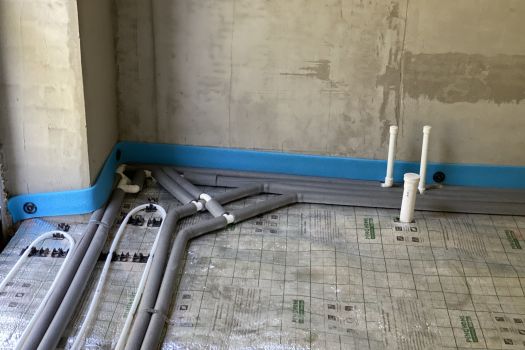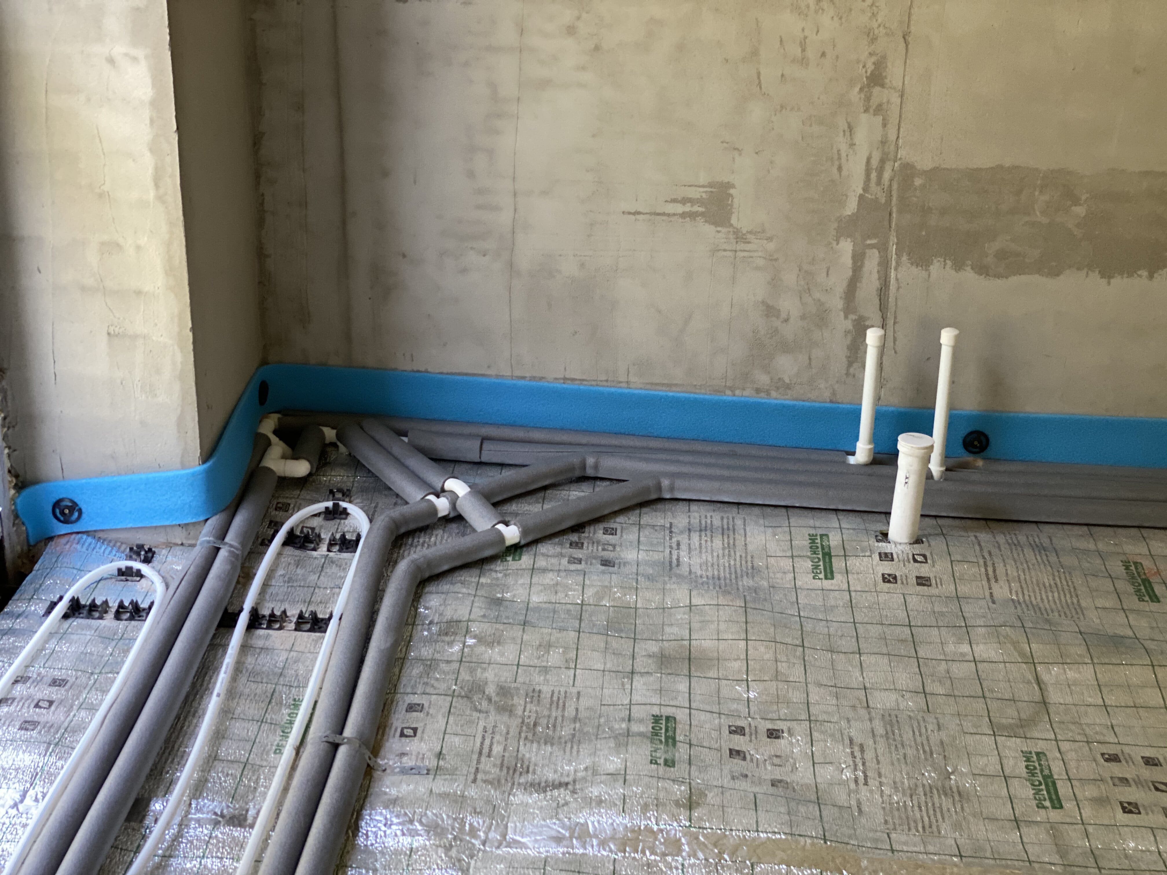 Техническое решение: Увеличенный диаметр труб связан с высокими потолками и большим витражным остеклением. Теплопотери помещения существенно выше, поэтому создана более энергоемкая система. Коллектор в гостевом санузле.