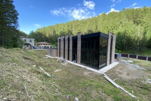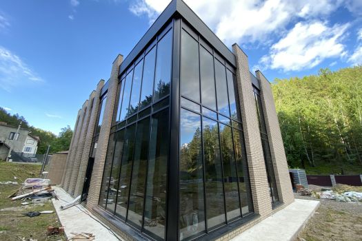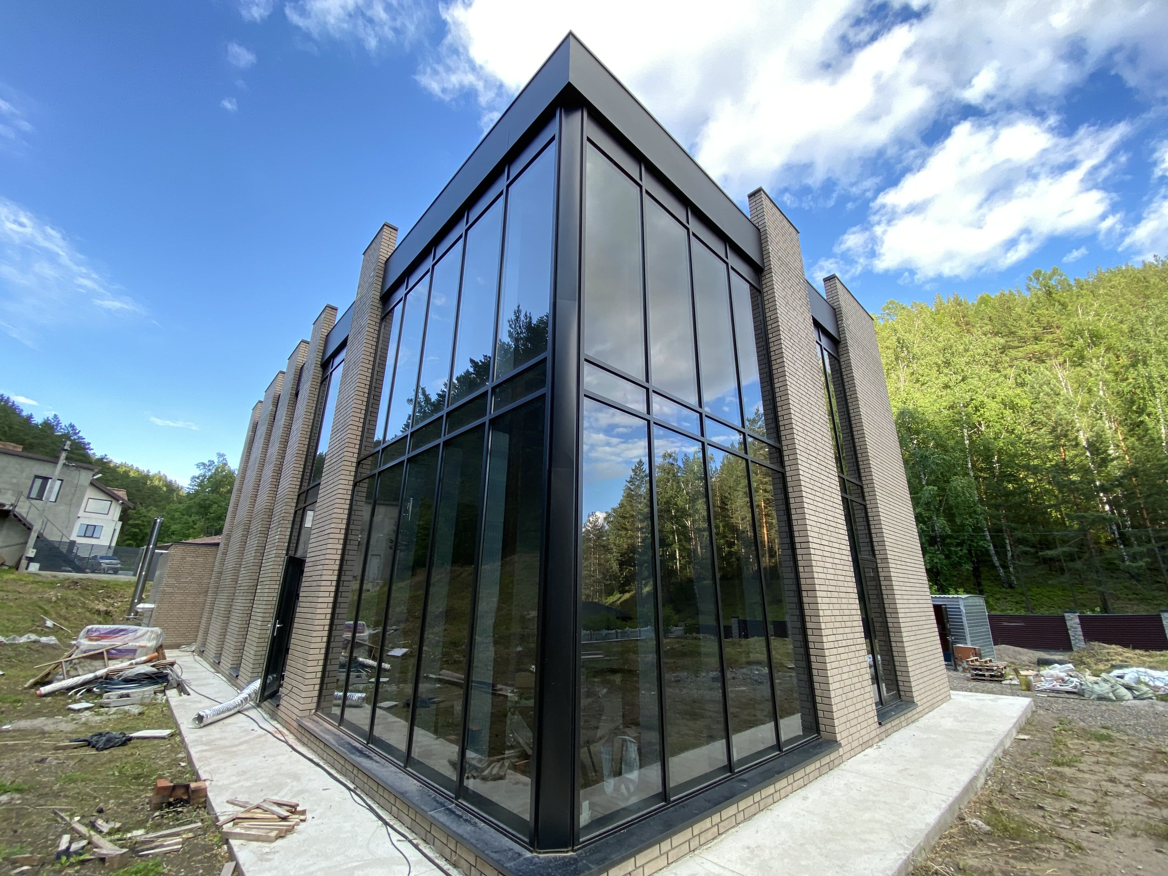 Материал стен: Витражное остекление, полнотелый и фасадный кирпич с утеплителем
